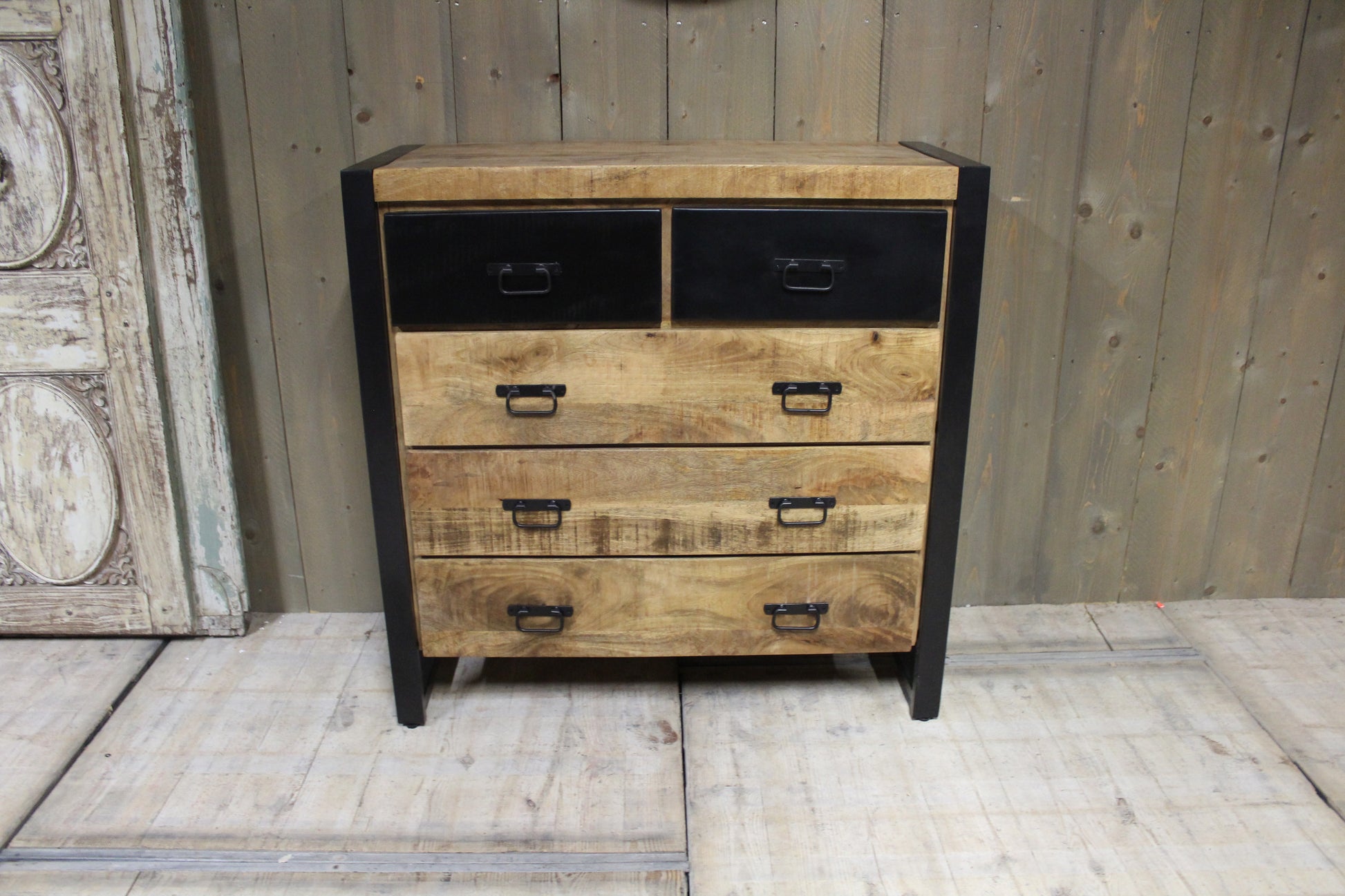 Deze wandkast van mangohout biedt een perfecte balans tussen stijl en functionaliteit. Het robuuste mangohout wordt gecombineerd met stoere zwarte metalen lades, wat zorgt voor een industriële uitstraling met een warme, natuurlijke touch. Met 2 kleine zwarte metalen lades boven en 3 grote lades onder, biedt deze kast volop opbergruimte voor zowel kleine als grotere items. De kast is ideaal voor in de woonkamer, hal, of als extra opbergruimte in je kantoor.