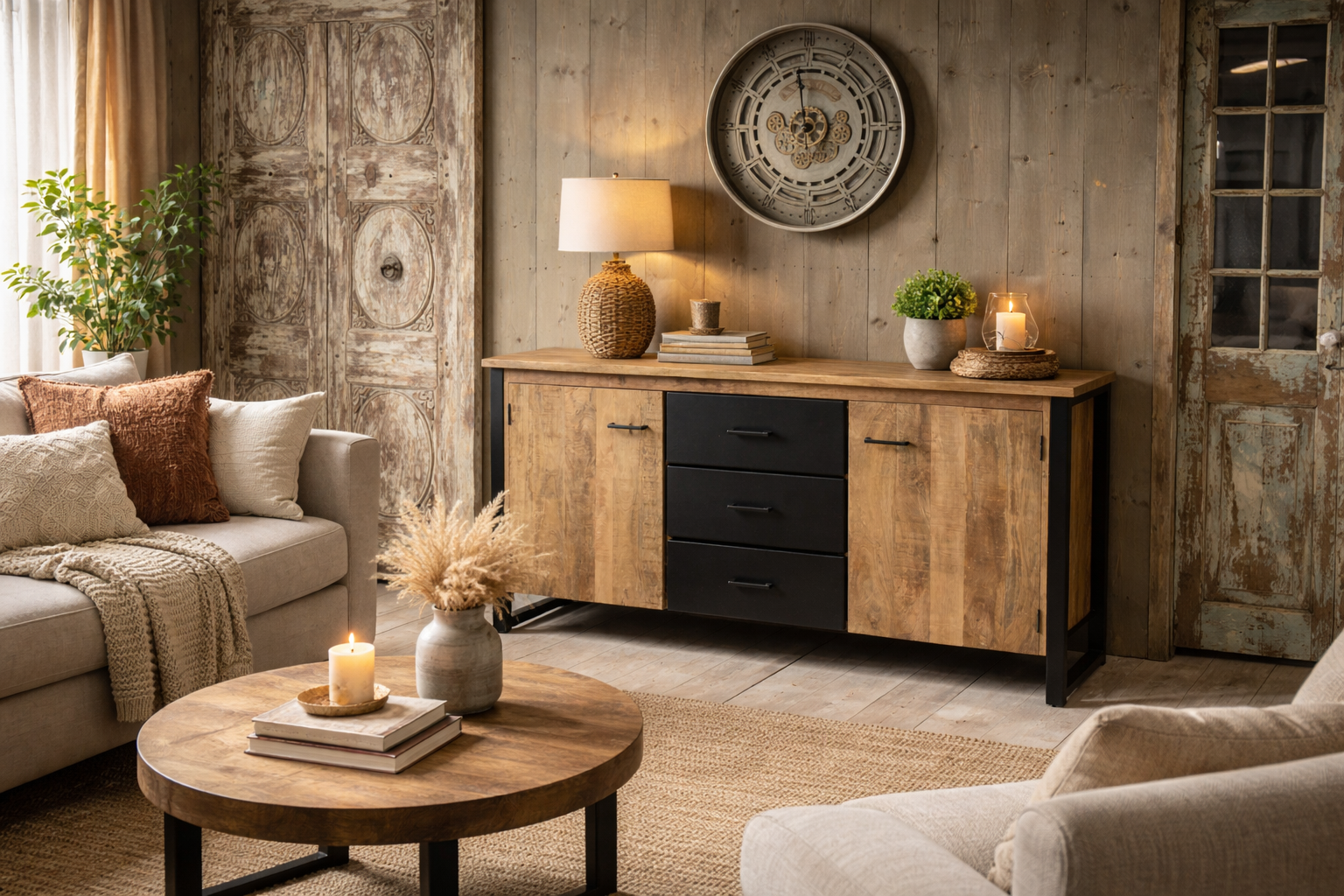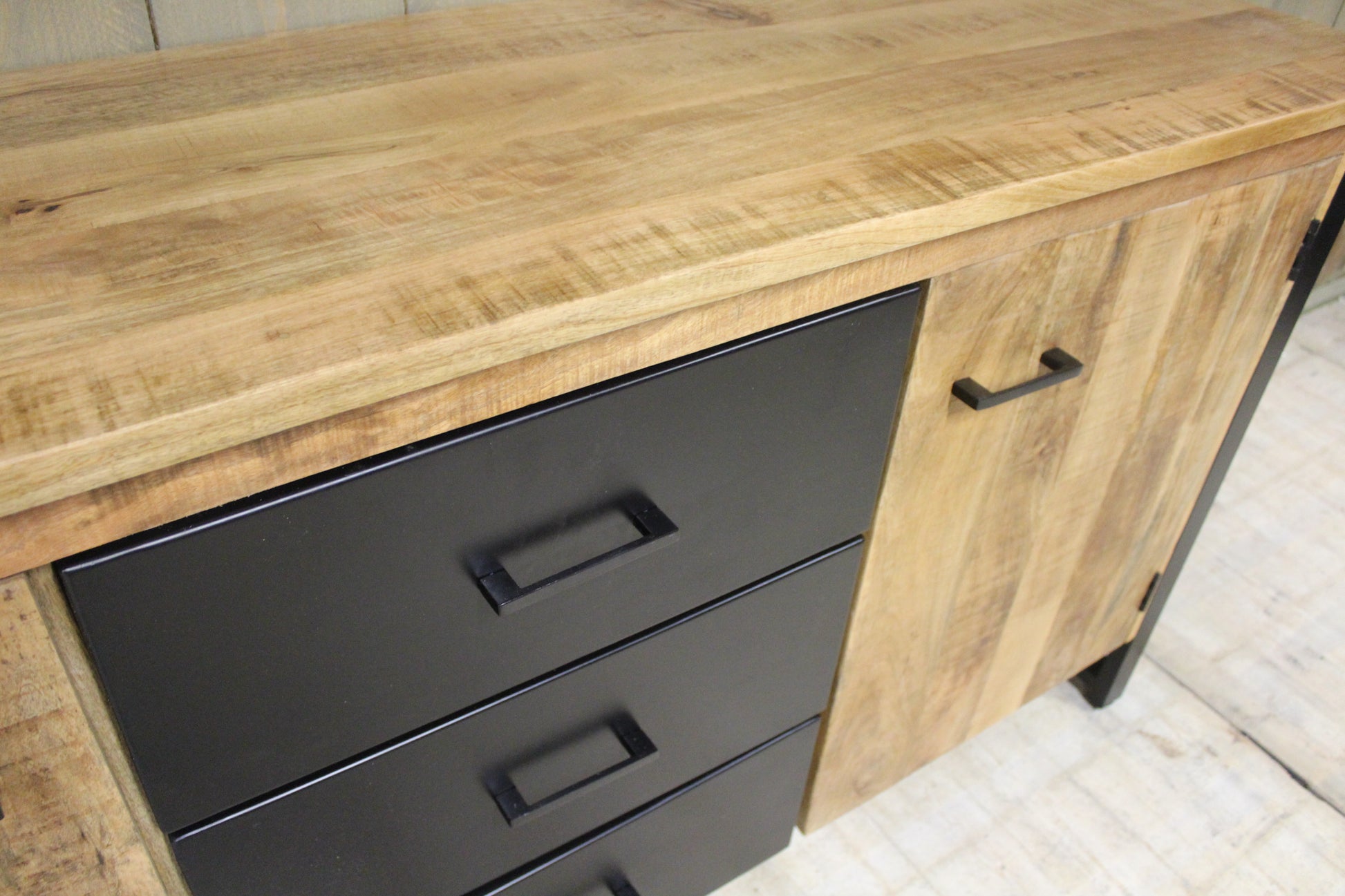 Materiaal: Massief mangohout voor een robuuste uitstraling, gecombineerd met zwart metalen lades voor een stoere, industriële look