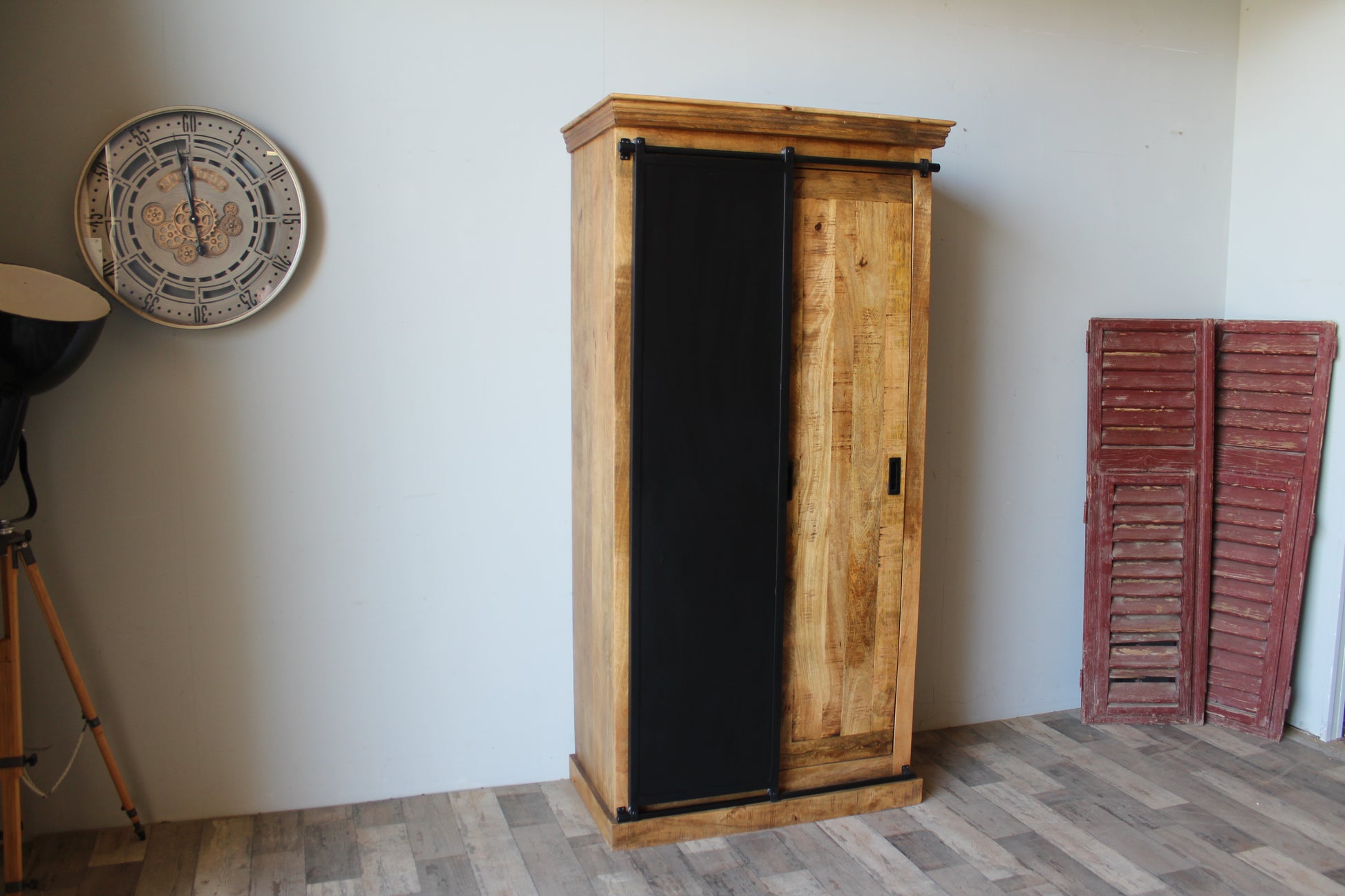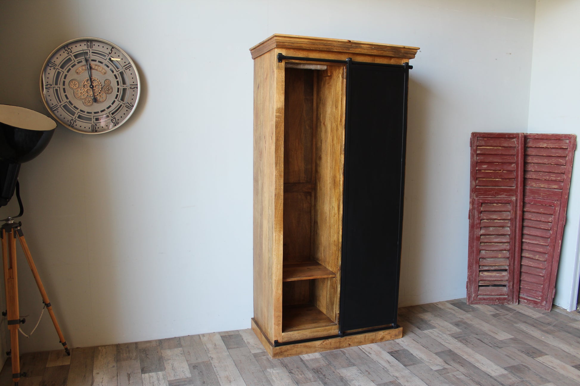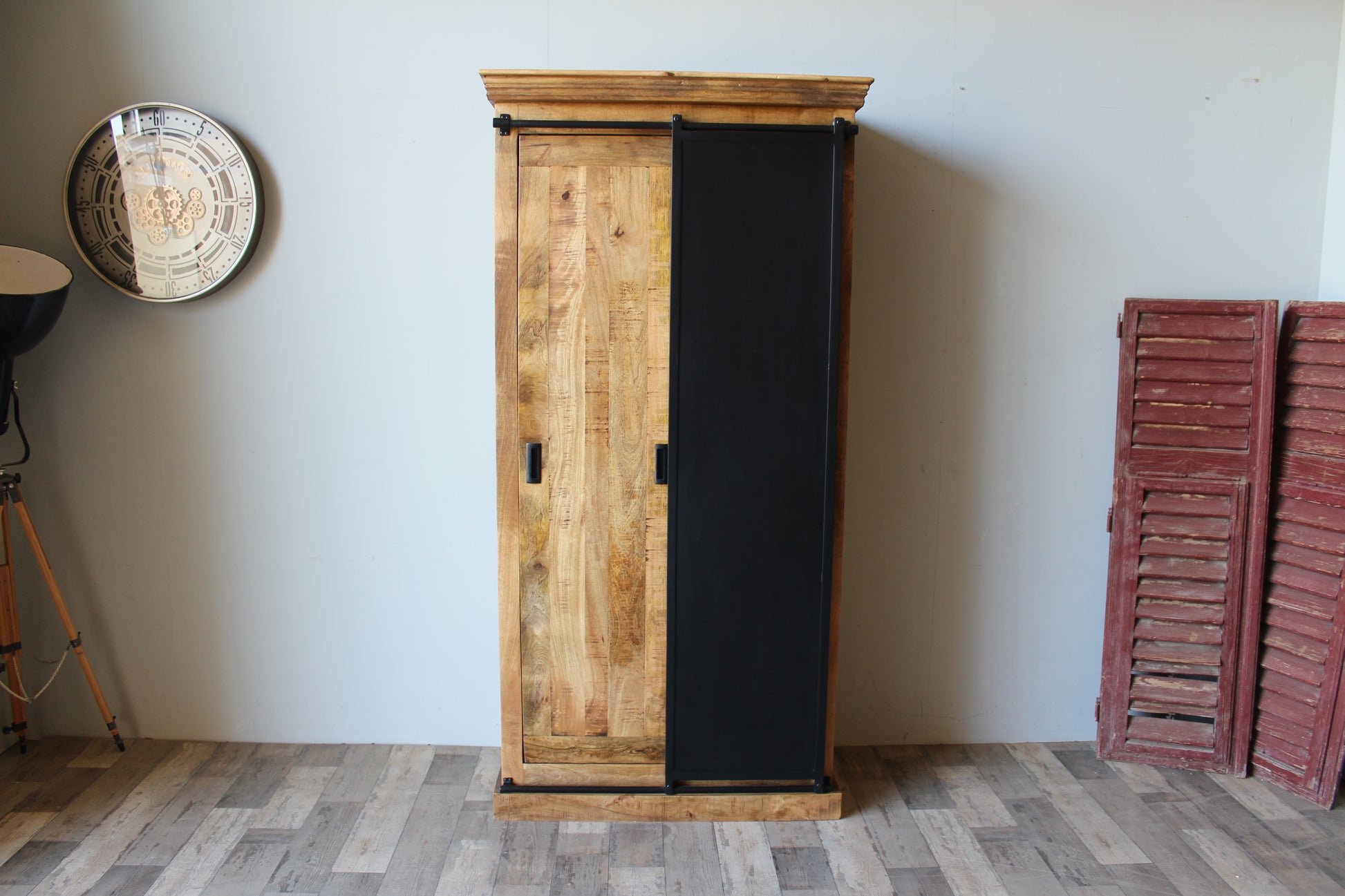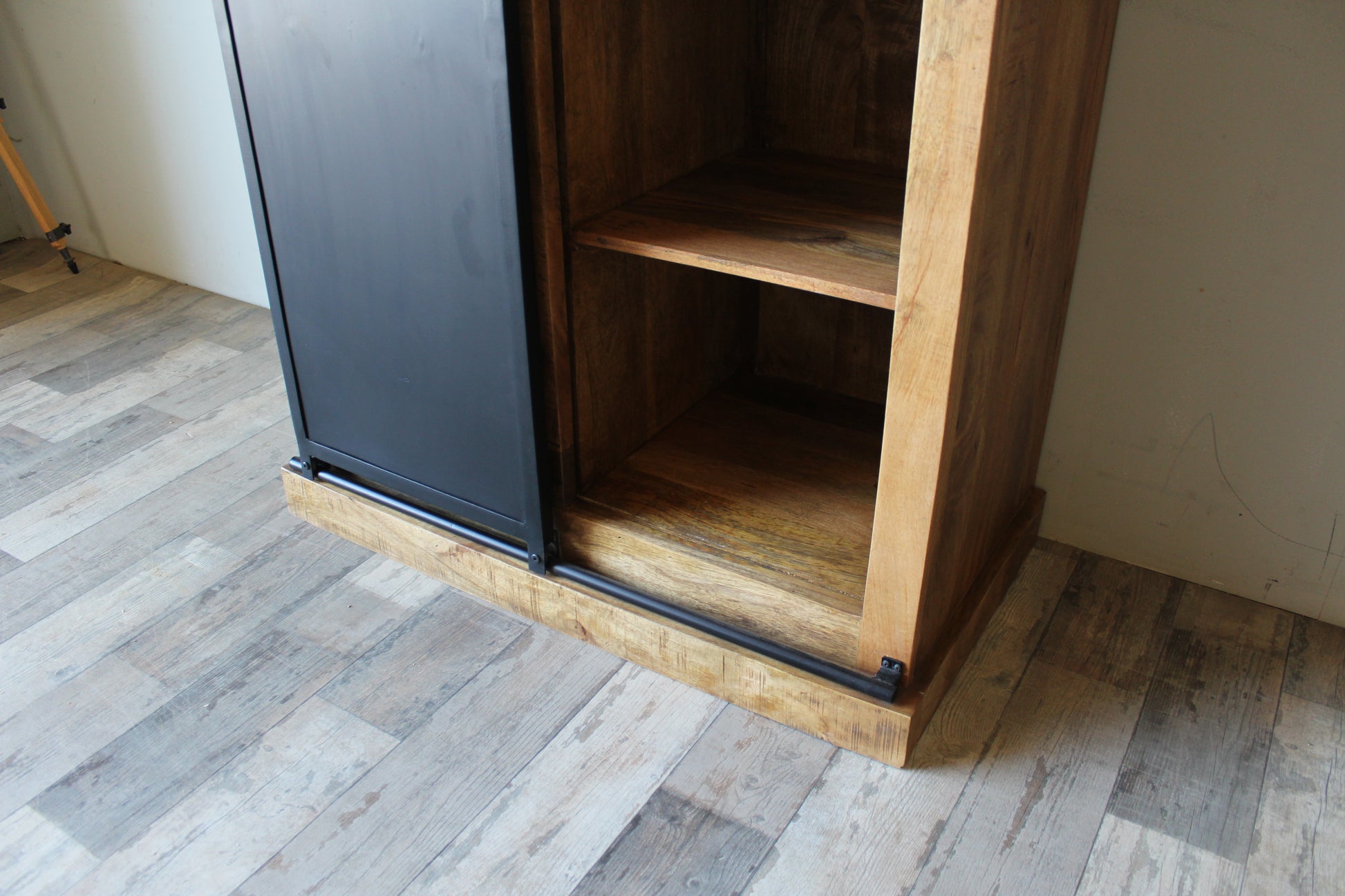 Voorzien van één houten schuifdeur en één metalen schuifdeur