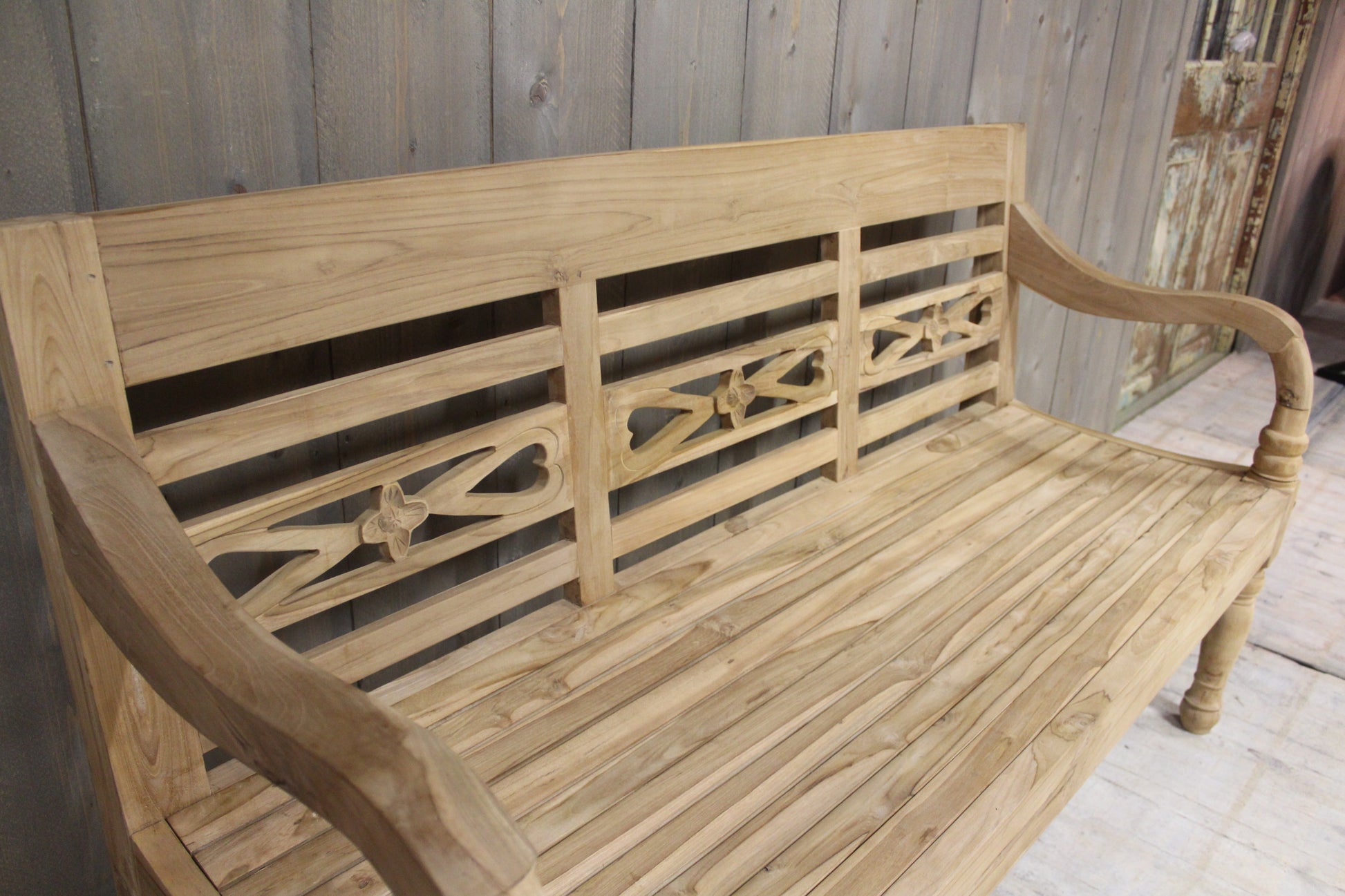 De rugleuning is voorzien van een verfijnd bloemmotief, zorgvuldig met de hand uitgesneden, wat zorgt voor een elegante en natuurlijke uitstraling. Dankzij het gebruik van massief teakhout is de bank bestand tegen diverse weersomstandigheden en geschikt voor buitengebruik.