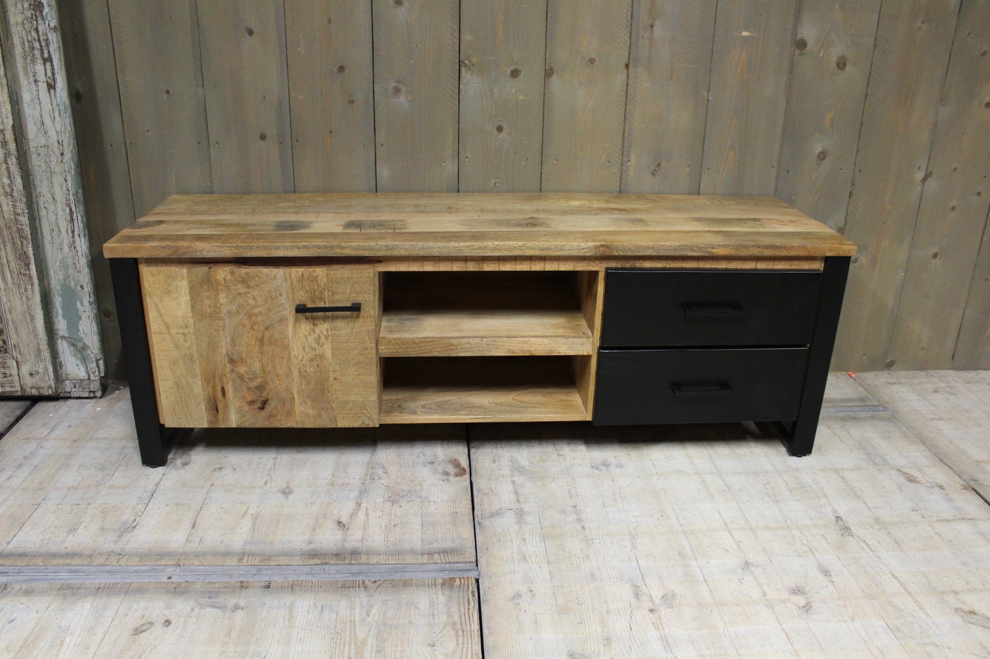 Voeg een vleugje industrieel design toe aan je woonkamer met deze Tv kast van mangohout. Het stijlvolle contrast tussen het warme mangohout en de 2 zwarte metalen lades zorgt voor een robuuste uitstraling, terwijl de 1 deur en het open vak met plankje zowel praktische opbergruimte bieden als ruimte voor je favoriete media-apparatuur of decoraties.