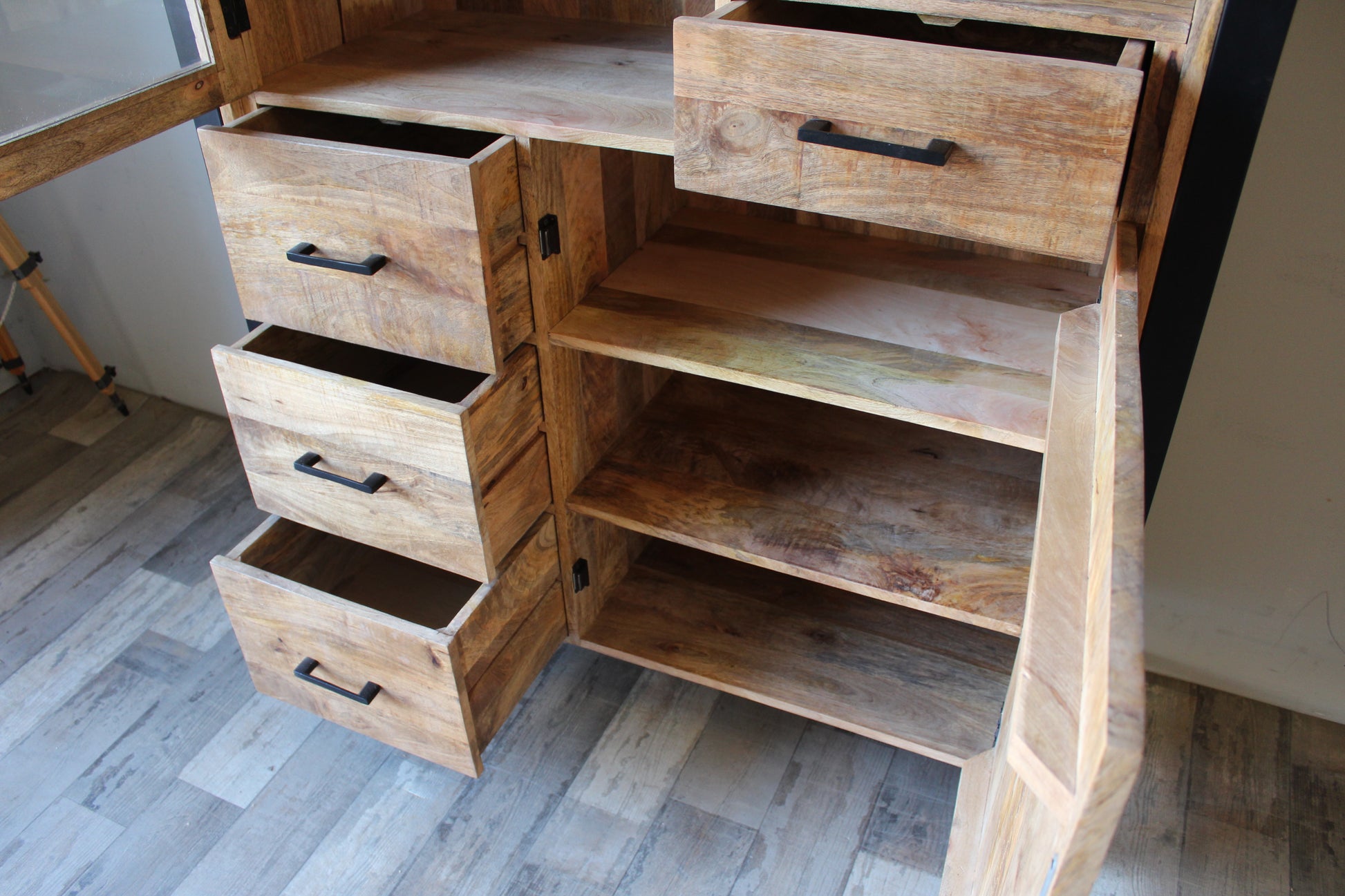 Voorzien van 4 lades, 1 glazen deur, 1 houten deur en 1 open vak