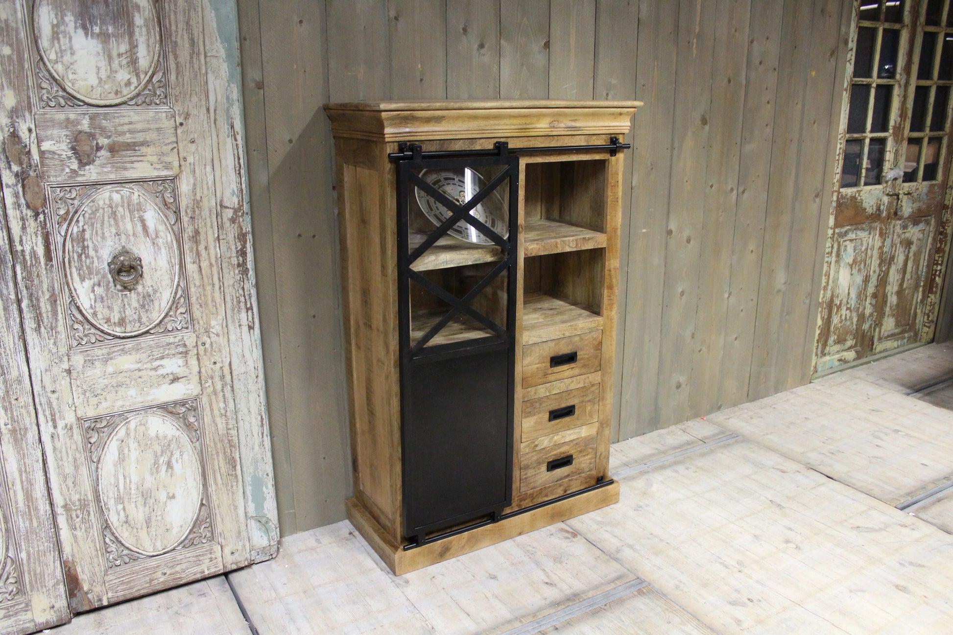 Voeg karakter en stijl toe aan je interieur met deze wandkast van mangohout. Het industriële ontwerp, gecombineerd met de metalen schuifdeur, biedt niet alleen een unieke uitstraling maar ook veel praktische opbergruimte. De 3 houten lades zijn perfect voor het opbergen van kleinere spullen, terwijl de 4 planken ideaal zijn voor het tentoonstellen van boeken, decoraties of andere persoonlijke items.